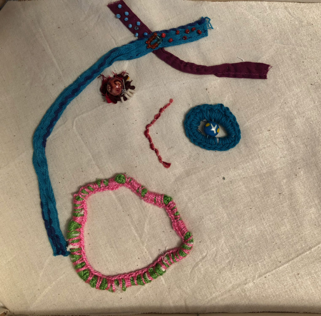 - série de 7 torchons brodés de haïkus, poèmes ou chansons évoquant les libellules, 69 x 50 cm